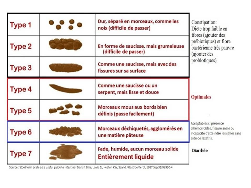 Les selles peuvent être anormales en raison de leur couleur (trop claires, trop foncées ou colorées), de leur consistance (trop dures, trop molles ou graisseuses) .
